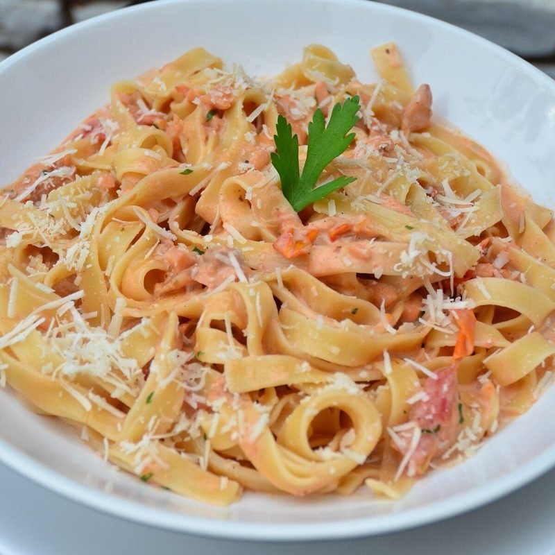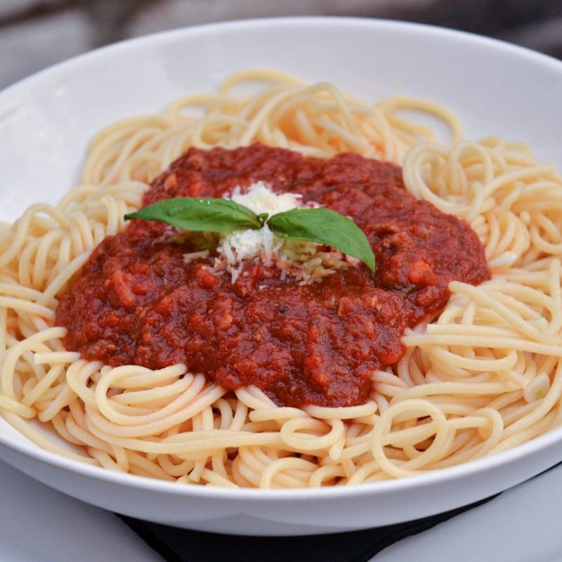 Spaghetti cu ulei de măsline, roșii cherry, pătrunjel proaspăt, fâșii de Parmesan și ardei iute.