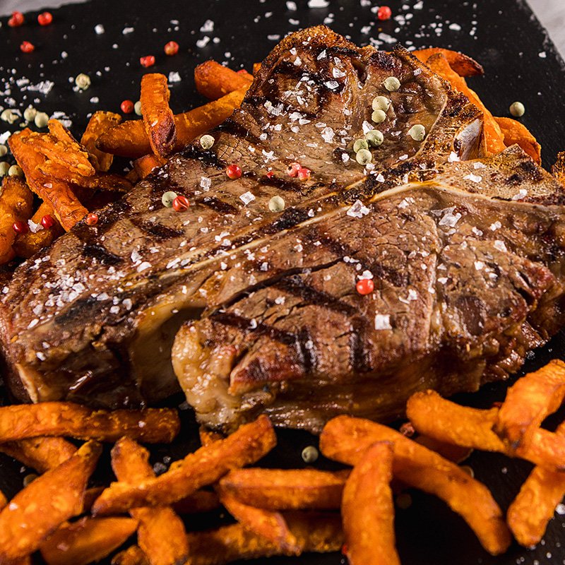 Antricot de vită feliat, cartofi dollar chips, salată rucola, fâșii de parmezan, roșii cherry