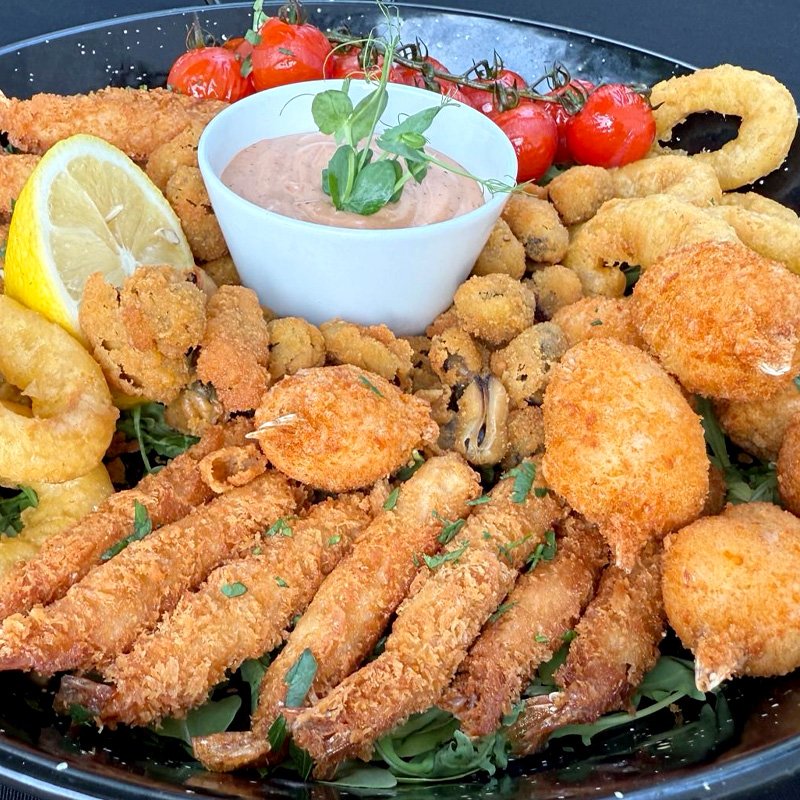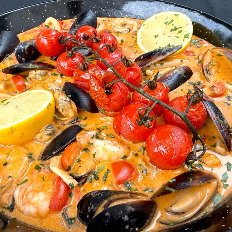 Creveți, carne de midii, midii în cochilie, inele de calamar, tentacule de calamar, ulei de măsline, usturoi, roșii cherry, smântănă dulce, pâine focaccia.